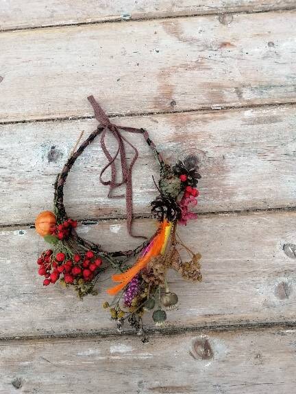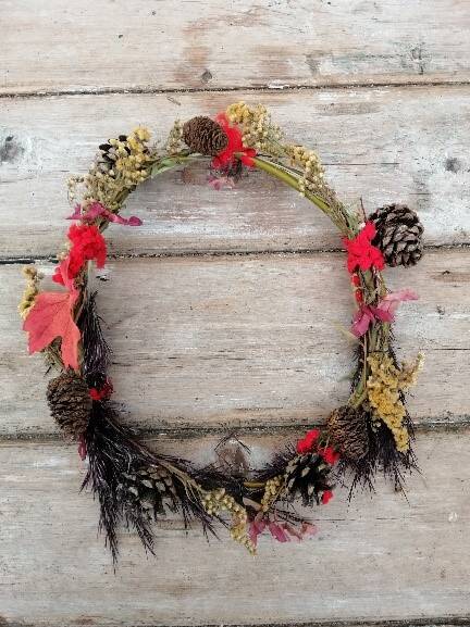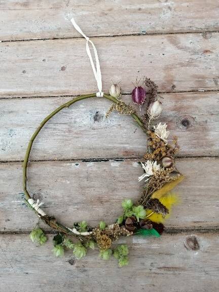 Deze krans gaan we versieren met gedroogde bloemen uit de omgeving.